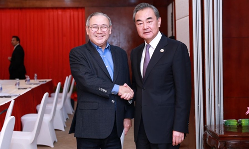 Chinese State Councilor and Foreign Minister Wang Yi (R) meets with Philippine Foreign Secretary Teodoro Locsin in Vientiane, Laos, February 19, 2020. Photo: Xinhua