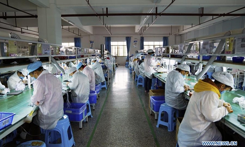 Staff members work at a factory of a company in Luocheng Mulao Autonomous County, south China's Guangxi Zhuang Autonomous Region, March 5, 2020. Under strict measures taken to fight against the novel coronavirus, the company has resumed production to help workers in the impoverished county to get rid of poverty. (Xinhua/Yang Chi)