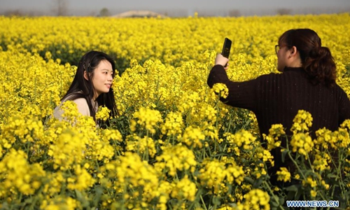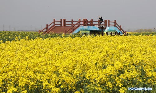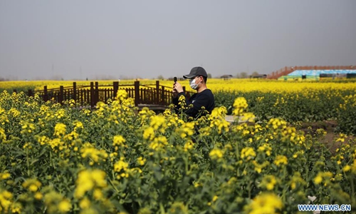 A visitor takes selfie with cole flowers in the background at Qianduo scenic spot in Xinghua City, east China's Jiangsu Province, March 17, 2020. (Xinhua/Li Yuze)