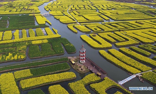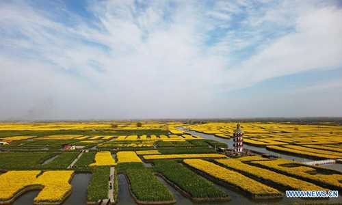 Aerial photo taken on March 17, 2020 shows cole flowers at Qianduo scenic spot in Xinghua City, east China's Jiangsu Province. (Xinhua/Li Yuze)