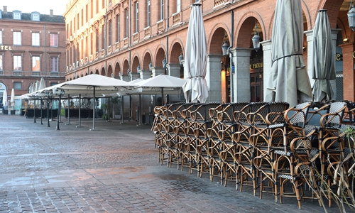 A picture taken on Sunday at the place du Capitole in the center of Toulouse, southern France showing chairs piled up as cafes and restaurants are closed amid the spread of COVID-19 Photo: AFP