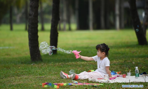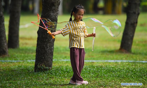 A child plays bubbles at Evergreen Park in Haikou, south China's Hainan Province, March 19. Photo:Xinhua