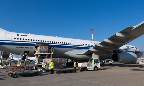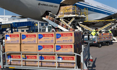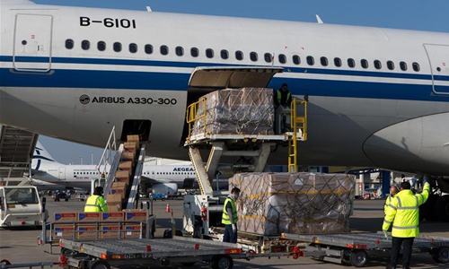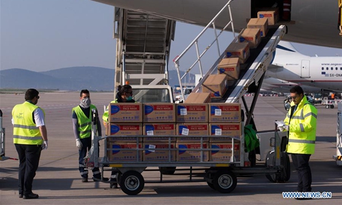 Airport staff unload boxes of face masks and medical supplies from an airplane of Air China, in Athens, Greece, on March 21, 2020. Approximately eight tons of medical supplies provided by the Chinese government to Greece after Athens' urgent request arrived on Saturday morning at Athens international airport on an Air China flight.The aid consists of 550,000 masks and sets of protective gear, according to a release issued by the Chinese embassy in Greece. (Xinhua/Marios Lolos)