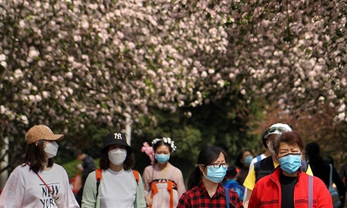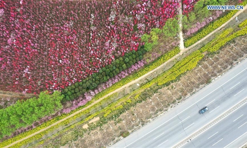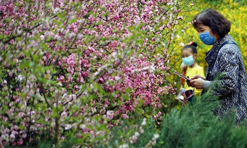 People take pictures near blooming flowers in Bishagang park in Zhengzhou, capital of central China's Henan Province, March 21, 2020. (Xinhua/Li An)