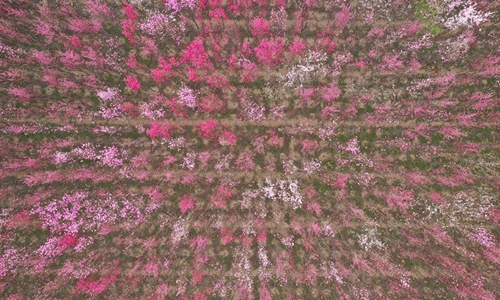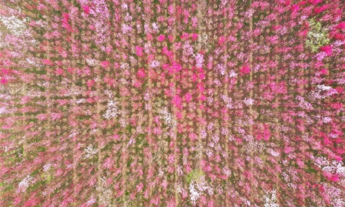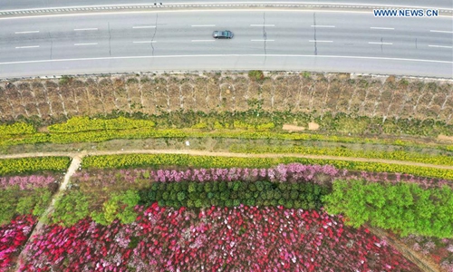 Aerial photo taken on March 21, 2020 shows the flower fields in Sishui Town of Xingyang City, central China's Henan Province. As the weather warms up, flowers in the town bloom amid spring breeze. (Xinhua/Feng Dapeng)