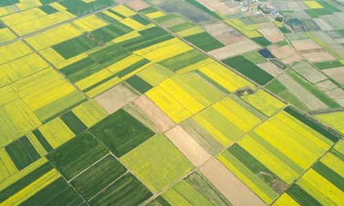 Aerial photo taken on March 22, 2020 shows the view of farms in Dangyang, central China's Hubei Province. Agriculture production was resumed in an orderly way in Dangyang. (Xinhua/Cheng Min)