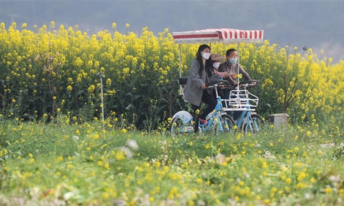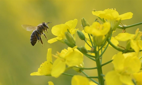 Photo taken on March 22, 2020 shows a bee foraging around flowers in Dangyang, central China's Hubei Province. Agriculture production was resumed in an orderly way in Dangyang. (Xinhua/Cheng Min)