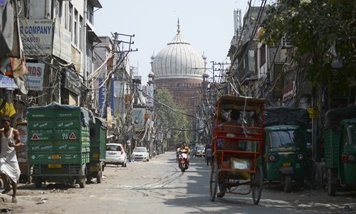 Commuters move through a deserted market during a one-day Janata (civil) curfew imposed amid concerns over the spread of the COVID-19, near Jama Masjid mosque in the old quarters of New Delhi, India on Sunday. Photo: AFP