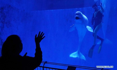 A visitor waves to a white whale at Polarland in Harbin, capital of northeast China's Heilongjiang Province, March 23, 2020. Polarland in Harbin reopened on Monday, and the number of visitors are limited to no more than 400 per day. (Xinhua/Wang Jianwei)