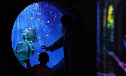 Visitors watch fishes at Polarland in Harbin, capital of northeast China's Heilongjiang Province, March 23, 2020. Polarland in Harbin reopened on Monday, and the number of visitors are limited to no more than 400 per day. (Xinhua/Wang Jianwei)