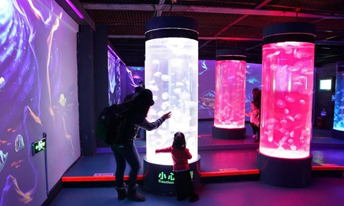 People watch jellyfishes at Polarland in Harbin, capital of northeast China's Heilongjiang Province, March 23, 2020. Polarland in Harbin reopened on Monday, and the number of visitors are limited to no more than 400 per day. (Xinhua/Wang Jianwei)