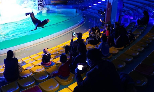 Visitors watch a sea lion perform at Polarland in Harbin, capital of northeast China's Heilongjiang Province, March 23, 2020. Polarland in Harbin reopened on Monday, and the number of visitors are limited to no more than 400 per day. (Xinhua/Wang Jianwei)
