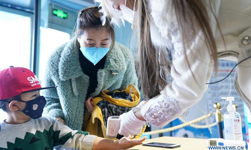 A staff member checks temperature of visitors at Polarland in Harbin, capital of northeast China's Heilongjiang Province, March 23, 2020. Polarland in Harbin reopened on Monday, and the number of visitors are limited to no more than 400 per day. (Xinhua/Wang Jianwei)