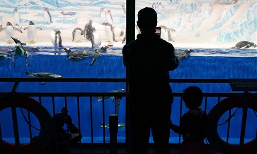 People watch penguins at Polarland in Harbin, capital of northeast China's Heilongjiang Province, March 23, 2020. Polarland in Harbin reopened on Monday, and the number of visitors are limited to no more than 400 per day. (Xinhua/Wang Jianwei)