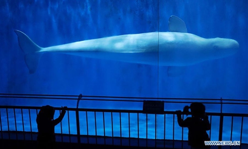 Children watch a white whale at Polarland in Harbin, capital of northeast China's Heilongjiang Province, March 23, 2020. Polarland in Harbin reopened on Monday, and the number of visitors are limited to no more than 400 per day. (Xinhua/Wang Jianwei)