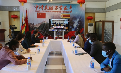 Senior officials from Zimbabwe's Ministry of Health and Harare City Council participate in the China-Africa Video Conference on COVID-19 in Harare, Zimbabwe, March 18, 2020. Photo: Xinhua