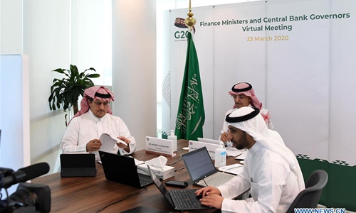 Governor of Saudi Arabian Monetary Authority Ahmed al-Kholifey (L) and Saudi Finance Minister Mohammed al-Jadaan (Rear) attend the G20 Finance Ministers and Central Bank Governors Virtual Meeting in Riyadh, Saudi Arabia, on March 23, 2020. The G20 finance ministers and central bank governors agreed on Monday during a televised meeting to develop a joint G20 Action Plan in response to the COVID-19, said a statement by the G20 Saudi secretariat. (G20 Saudi Arabia/Handout via Xinhua)