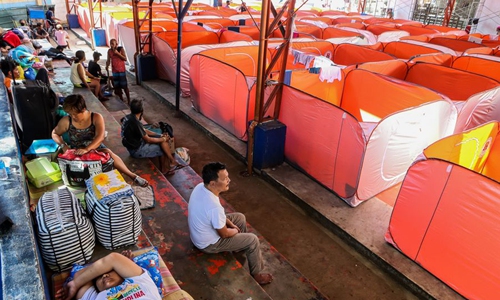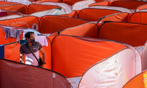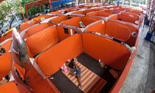Modular tents were set up for street dwellers at a sheltered basketball court in Manila, the Philippines to stop the further spread of COVID-19.(Xinhua/Rouelle Umali)