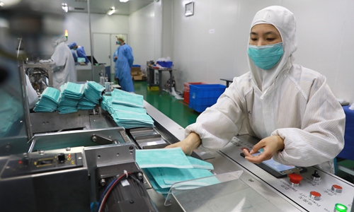 A worker produces face masks at a factory in Lianyungang, East China’s Jiangsu Province on Tuesday. Local government has encouraged enterprises to produce masks as China fights the epidemic. Photo: cnsphoto