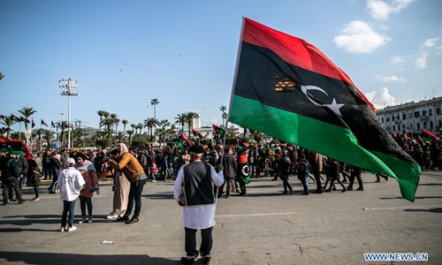A Libyan man holds a Libyan flag during the celebrations of the 9th anniversary of the Libyan revolution in Tripoli, Libya, on Feb. 17, 2020. (Photo by Amru Salahuddien/Xinhua)