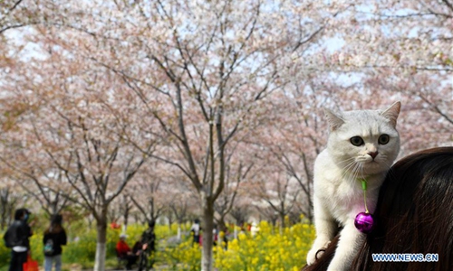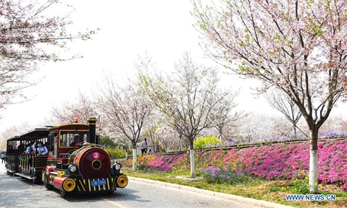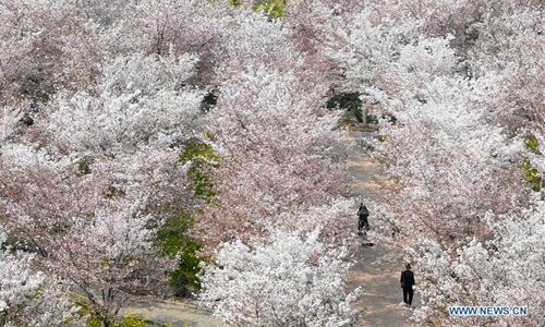 Tourists view cherry blossoms at a cherry tree garden in Xingyang, central China's Henan Province, March 24, 2020. (Xinhua/Hao Yuan)