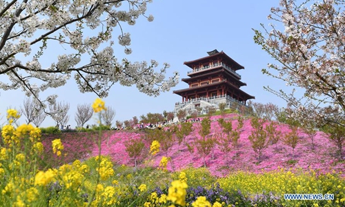 Photo taken on March 24, 2020 shows the cherry blossoms at a cherry tree garden in Xingyang, central China's Henan Province. (Xinhua/Hao Yuan)