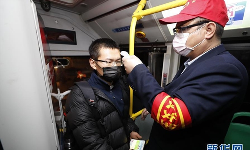 A passenger has his temperature taken at bus No. 518 in Wuhan, Hubei Province, on March 25, 2020. A safety supervisor was on each bus, whose duty was to make sure all passengers are healthy as their health code shows before boarding. (Photo/Xinhua