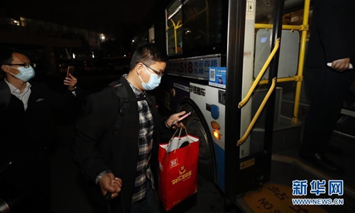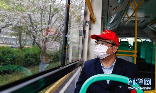 A safety supervisor is seen on a bus departed from its terminus at Wuchang Railway Station at 5:25 a.m. March 25, 2020. Wuhan starts to resume bus service after nine weeks of lockdown. (Photo/Xinhua)