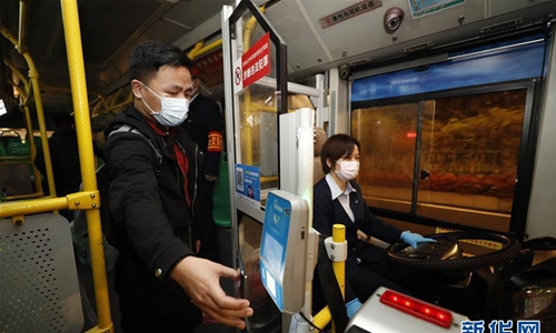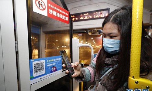 A passenger uses mobile payment to take the bus in Wuhan, central China's Hubei Province, March 25, 2020. (Photo/Xinhua)