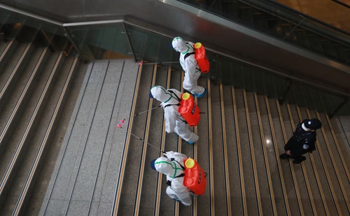 Firefighters conduct disinfection on the stairs leading to the exit of Wuhan Railway Station in Wuhan, central China's Hubei Province, March 24, 2020. (Photo by Zhao Jun/Xinhua)