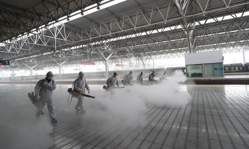 Firefighters conduct disinfection on the platform at Yichang East Railway Station in Yichang, central China's Hubei Province, March 24, 2020. (Photo by Wang Shen/Xinhua)