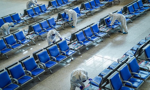 Firefighters clean the seats after disinfection at the Wuhan Railway Station in Wuhan, central China's Hubei Province, March 24, 2020. (Photo by He Hanqiu/Xinhua)