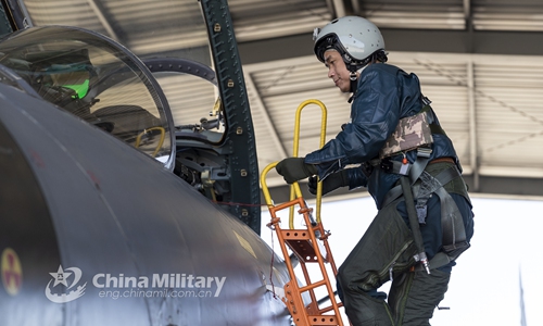 A pilot assigned to an aviation brigade of the air force under the PLA Eastern Theater Command climbs into the cockpit of his J-11 fighter jet prior to a round-the-clock flight training exercise on March 20, 2020. (eng.chinamil.com.cn/Photo by Zhang Shu)