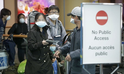 Travelers wearing face masks are seen at Vancouver International Airport in Richmond, Canada, March 16, 2020. (Photo by Liang Sen/Xinhua)