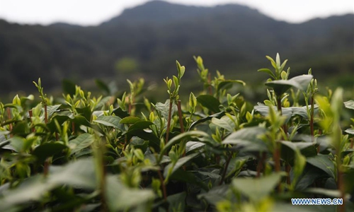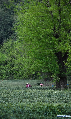 Photo taken on March 25, 2020 shows the West Lake Longjing tea trees in Meijiawu Village of Hangzhou, east China's Zhejiang Province. Farmers in Hangzhou are busy harvesting West Lake Longjing tea leaves ahead of the Qingming Festival to produce the Mingqian (meaning "pre-Qingming") tea, which is made of the very first tea sprouts in spring and considered to be of high quality. (Xinhua/Xu Yu)