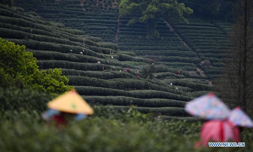 Tea-picking workers harvest West Lake Longjing tea leaves at a tea garden in Meijiawu Village of Hangzhou, east China's Zhejiang Province, March 25, 2020. Farmers in Hangzhou are busy harvesting West Lake Longjing tea leaves ahead of the Qingming Festival to produce the Mingqian (meaning "pre-Qingming") tea, which is made of the very first tea sprouts in spring and considered to be of high quality. (Xinhua/Xu Yu)