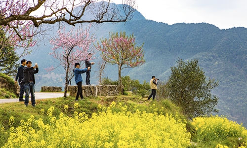 Tourists take photos of flowers in Wuyuan on March 21. Photo: IC