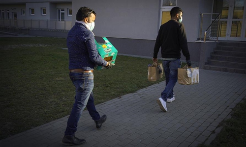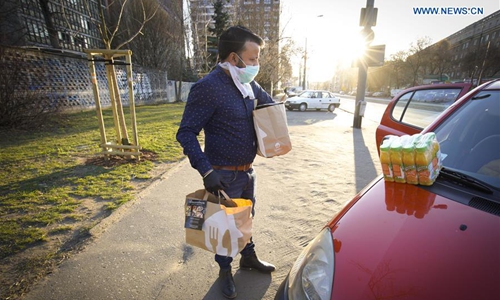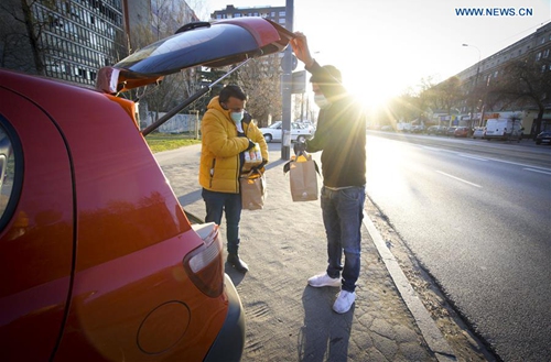 Suresh Goyal (L) takes meals from his car to deliver to a hospital in Warsaw, Poland on March 24, 2020. Suresh Goyal, owner of an Indian taste restaurant, has been making meals to deliver to hospitals in Warsaw for medical personnel recently, due to the outbreak of COVID-19 there. (Photo by Jaap Arriens/Xinhua)