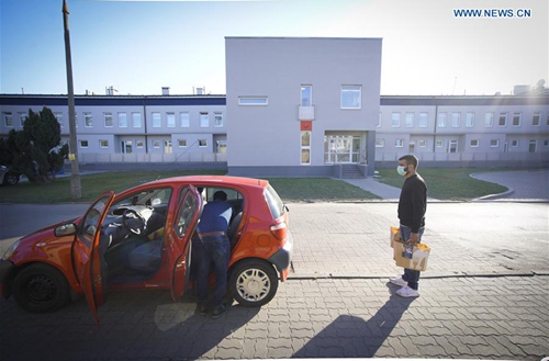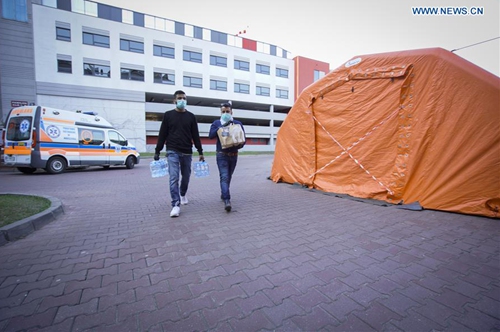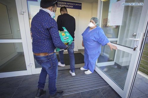 Suresh Goyal (R) and a courier deliver free meals and drinks to a hospital in Warsaw, Poland on March 24, 2020. Suresh Goyal, owner of an Indian taste restaurant, has been making meals to deliver to hospitals in Warsaw for medical personnel recently, due to the outbreak of COVID-19 there. (Photo by Jaap Arriens/Xinhua)