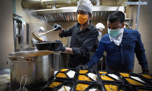 Suresh Goyal (R) and a cook prepare meals in the restaurant before the daily delivery of meals to hospitals in Warsaw, Poland on March 24, 2020. Suresh Goyal, owner of an Indian taste restaurant, has been making meals to deliver to hospitals in Warsaw for medical personnel recently, due to the outbreak of COVID-19 there. (Photo by Jaap Arriens/Xinhua)