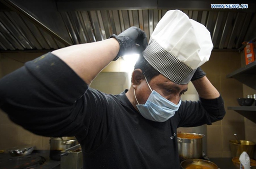 A cook puts on a face mask to start preparing free food for medical workers in Warsaw, Poland on March 24, 2020. Suresh Goyal, owner of an Indian taste restaurant, has been making meals to deliver to hospitals in Warsaw for medical personnel recently, due to the outbreak of COVID-19 there. (Photo by Jaap Arriens/Xinhua)