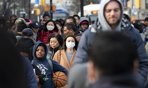 People wear face masks as they walk down a street in Flushing area of Queens on Monday in New York City. Photo: AFP