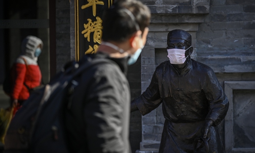 A bronze statue (R) wearing a face mask is seen at the entrance of a shop along a business street in Beijing. Photo: AFP