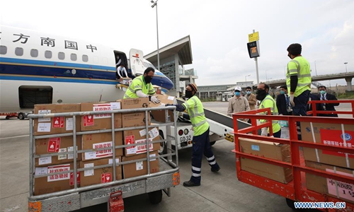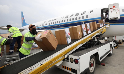 Workers unload the medical materials arrived with the Chinese medical expert team at the Islamabad International Airport in Islamabad, capital of Pakistan, March 28, 2020. An 8-member medical expert team organized by the Chinese government arrived here on Saturday to help Pakistan fight the COVID-19 pandemic.Photo:Xinhua
