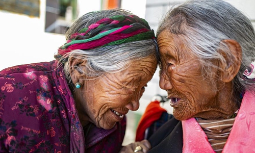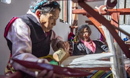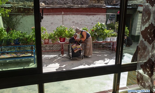 Sonam Drolma (R) interacts with her sister in Reguo Village of Gyaca County in Shannan, southwest China's Tibet Autonomous Region, March 24, 2020. Saturday marks the Serfs' Emancipation Day. Sixty-one years ago, more than one million people, or 90 percent of the region's population of that time, were liberated from the feudal serfdom. Sonam Drolma is a 109-year-old villager in Reguo Village of Shannan. Since she was born, she has gone through half a century of twists and turns and sufferings as a serf. As a descendant of serfs, Sonam Drolma began to work for serf owners at the age of 15. Sonam served as a serf for 47 years, witnessing her parents and brother die at an early age because of the overwork and poor living conditions. After the democratic reform, she owned the land, houses, cattle and sheep that she had never dreamed of. Since then, she never had to live the life being exploited and oppressed. Then Sonam Drolma gave birth to her daughter. After China's reform and opening up in early 1980s, Sonam Drolma's daughter Tsering Dzongpa picked up the baton of the family, going all out to make the family shake off poverty and have a well-off life by hard working. Sonam's family first contracted 11 mu (about 0.73 hectare) of land and seven walnut trees in the village. Then Tsering Dzongpa started to make a living by woolen weaving. Hard work brings rich returns. The family bought walking tractors, winnowing machines and other machinery one by one, and became the first family in the village to buy a car. Nowadays, Sonam's family produces more than 5,000 kilograms of grain and 700 kilograms of walnuts annually. If taking the income of woolen weaving into account, the annual income of her family is close to 100,000 yuan (about 14,096 U.S. dollars). The family has expanded their houses for five times. In 2017, they even spent 540,000 yuan (about 76,118 U.S. dollars) to build a new house with an area of 520 square meters. Photo:Xinhua