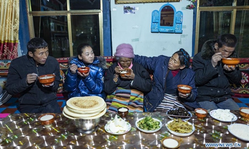 Sonam Drolma (C) and her family have a meal in Reguo Village of Gyaca County in Shannan, southwest China's Tibet Autonomous Region, March 24, 2020. Saturday marks the Serfs' Emancipation Day. Sixty-one years ago, more than one million people, or 90 percent of the region's population of that time, were liberated from the feudal serfdom. Sonam Drolma is a 109-year-old villager in Reguo Village of Shannan. Since she was born, she has gone through half a century of twists and turns and sufferings as a serf. As a descendant of serfs, Sonam Drolma began to work for serf owners at the age of 15. Sonam served as a serf for 47 years, witnessing her parents and brother die at an early age because of the overwork and poor living conditions. After the democratic reform, she owned the land, houses, cattle and sheep that she had never dreamed of. Since then, she never had to live the life being exploited and oppressed. Then Sonam Drolma gave birth to her daughter. After China's reform and opening up in early 1980s, Sonam Drolma's daughter Tsering Dzongpa picked up the baton of the family, going all out to make the family shake off poverty and have a well-off life by hard working. Sonam's family first contracted 11 mu (about 0.73 hectare) of land and seven walnut trees in the village. Then Tsering Dzongpa started to make a living by woolen weaving. Hard work brings rich returns. The family bought walking tractors, winnowing machines and other machinery one by one, and became the first family in the village to buy a car. Nowadays, Sonam's family produces more than 5,000 kilograms of grain and 700 kilograms of walnuts annually. If taking the income of woolen weaving into account, the annual income of her family is close to 100,000 yuan (about 14,096 U.S. dollars). The family has expanded their houses for five times. In 2017, they even spent 540,000 yuan (about 76,118 U.S. dollars) to build a new house with an area of 520 square meters. Photo:Xinhua
