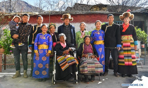 Sonam Drolma and her family pose for a group photo in Reguo Village of Gyaca County in Shannan, southwest China's Tibet Autonomous Region, March 24, 2020. Saturday marks the Serfs' Emancipation Day. Sixty-one years ago, more than one million people, or 90 percent of the region's population of that time, were liberated from the feudal serfdom. Sonam Drolma is a 109-year-old villager in Reguo Village of Shannan. Since she was born, she has gone through half a century of twists and turns and sufferings as a serf. As a descendant of serfs, Sonam Drolma began to work for serf owners at the age of 15. Sonam served as a serf for 47 years, witnessing her parents and brother die at an early age because of the overwork and poor living conditions. After the democratic reform, she owned the land, houses, cattle and sheep that she had never dreamed of. Since then, she never had to live the life being exploited and oppressed. Then Sonam Drolma gave birth to her daughter. After China's reform and opening up in early 1980s, Sonam Drolma's daughter Tsering Dzongpa picked up the baton of the family, going all out to make the family shake off poverty and have a well-off life by hard working. Sonam's family first contracted 11 mu (about 0.73 hectare) of land and seven walnut trees in the village. Then Tsering Dzongpa started to make a living by woolen weaving. Hard work brings rich returns. The family bought walking tractors, winnowing machines and other machinery one by one, and became the first family in the village to buy a car. Nowadays, Sonam's family produces more than 5,000 kilograms of grain and 700 kilograms of walnuts annually. If taking the income of woolen weaving into account, the annual income of her family is close to 100,000 yuan (about 14,096 U.S. dollars). The family has expanded their houses for five times. In 2017, they even spent 540,000 yuan (about 76,118 U.S. dollars) to build a new house with an area of 520 square meters. Photo:Xinhua