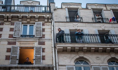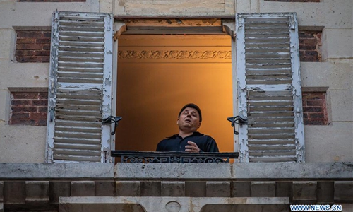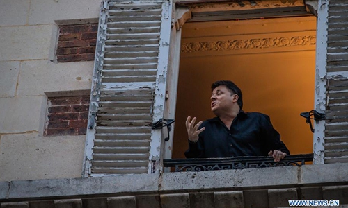 French tenor Stephane Senechal sings from his window for the inhabitants of his street in Paris, France, March 28, 2020. France is under lockdown in an attempt to contain the spread of the COVID-19. Photo:Xinhua