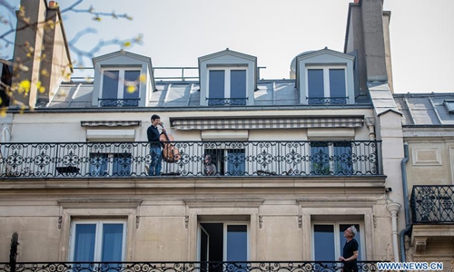 Cellist Camilo Peralta plays the cello on his balcony in Paris, France, March 28, 2020. France is under lockdown in an attempt to contain the spread of the COVID-19. Photo:Xinhua