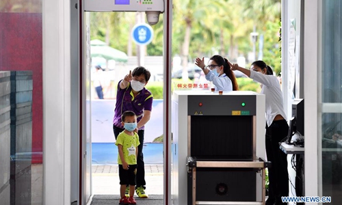 A citizen guides a child to pass the tempreaure-checking gate at the provincial museum in Haikou, capital of south China's Hainan Province on March 29, 2020. The museum reopened to public Tuesday as the epidemic waned. (Xinhua/Guo Cheng)